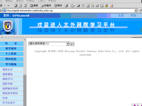 那么您如何进入北外网络课件的学习?首先用您的学习账号登录北外网络教育平台www.beiwaionline.com,点击左侧学习园地,选择课程学习,您就可以看到您的课程列表。通过下拉菜单选择您要学习的课程,即可进入课件的学习。