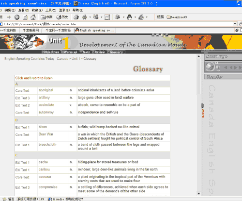 3.右边(有些课程没有,相应的功能模块放置在左框架中)为课程的功能区,包括MediaPlayer媒体播放器、Recorder网络录音机和功能模块(主要为单词和相关注释)