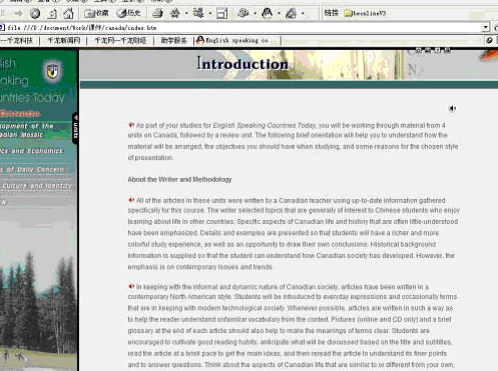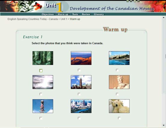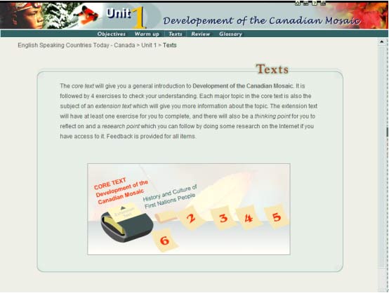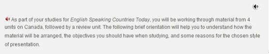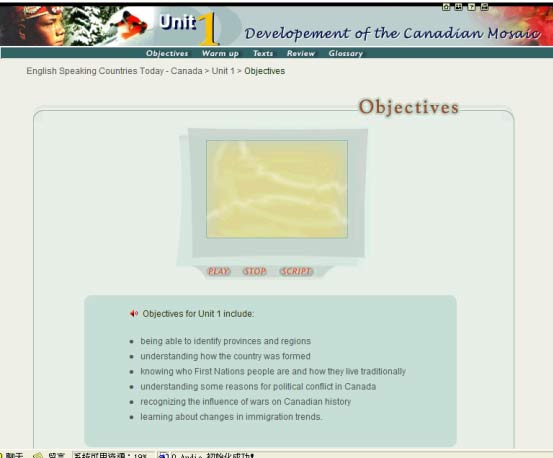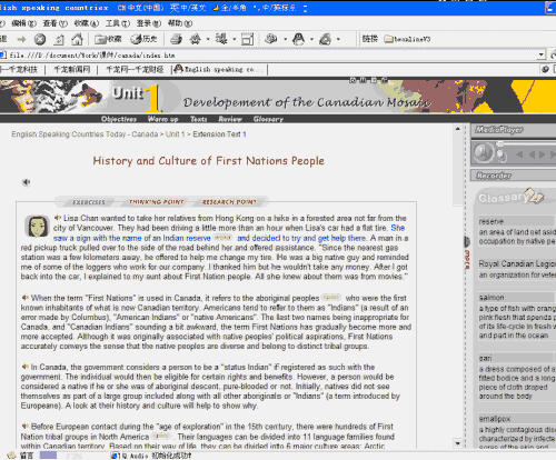 左侧顶部- English Speaking Countries Today Canada 是您正在学习的课程的名字,而美丽的加拿大森林则将这门课程的目录展示在您的面前。本课程共分为5个单元,轻轻点击单元名,您将进入到课程各个精彩的章节。
