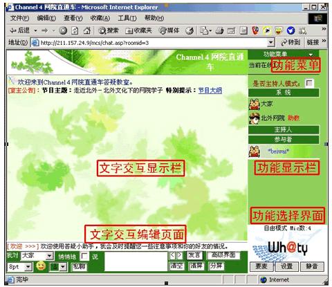 频道界面显示分为四个区域:功能选择界面、功能显示栏、文字交互显示栏、文字交互编辑界面。
