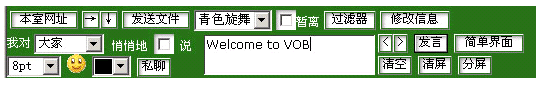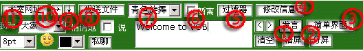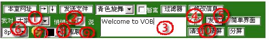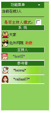 - 表情选择,提供13种表情图释,点击图释即为选中,点击“发言”按钮或回车键,表情图释立刻显示在文字交互显示栏中。