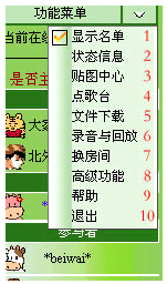 点击“换房间”按钮之后,功能显示栏显示房间列表。首先需要选择房间所在的房间组。选定房间组之后,房间组中的各个房间随即罗列在功能显示栏中。房间信息包括房间名称、在线人数等必要信息。决定选择去向后,点击房间名称下的按钮“GO”,系统自动转入选定的房间。