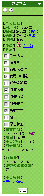点击“状态信息”按钮后,功能显示栏将显示相关用户的全部信息及状态。在此版面上,除了头像、所在房间、和查看个人资料为可修改或点开项,其他均无权操作,误操作会造成信息显示错误。