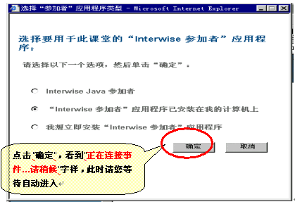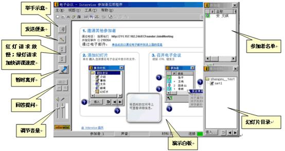 建议稍等片刻,因为刚刚进入课堂,需要 3 - 30 秒时间接收到声音和图象,系统会给你相关的提示。在你登陆的时候,系统会自动检测你的带宽,如果你的带宽只满足语音和幻灯片信号的接收,系统会自动关闭你的视频接收功能;如果你的带宽只满足语音信号的接收,系统会自动关闭你的视频和幻灯片接收功能;如果你的带宽连语音信号的接收都不能满足,系统会自动断开并开始重新登陆。这种情况下,你看到的就是一个虚的参加者界面。