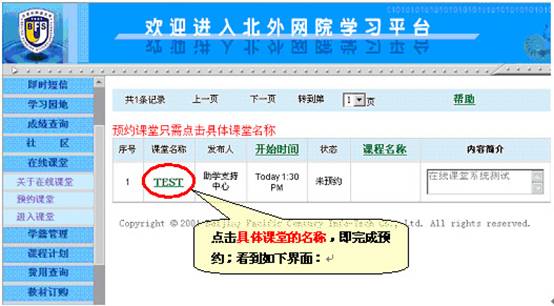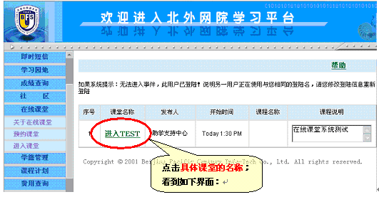 在线课堂(Virtual Online Classroom)是供学生们参与实时性、交互性的学习活动的多功能网上授课平台,它实现了语音、幻灯片、白板、问答、便条、程序共享等教学活动在同一操作界面的动态整合。VOC 和 VOB 是彼此独立的两个语音交互平台。前者是在线课堂,演示功能强,更适于授课和讲座;后者是语音聊天室,交互性强,更适于口语聊天及学友间自主交流。两者分别位于学习平台的在线课堂和社区内。