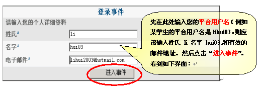 然后在弹出的参加页面填写姓名和邮件地址,并点击“进入事件”